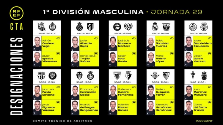 西甲第29轮裁判安排